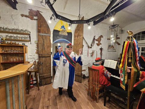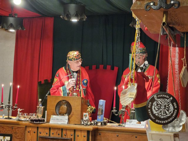Dann war es soweit: Die Spannung stieg, das Licht wurde feierlich gedimmt, und der Ritterschlag begann. Inmitten würdevoller Klänge trat Rt. Silvartifex, der fungierende Oberschlaraffe, in Erscheinung und übernahm mit ruhiger Stimme und sicherer Hand die Leitung der ehrwürdigen Zeremonie.